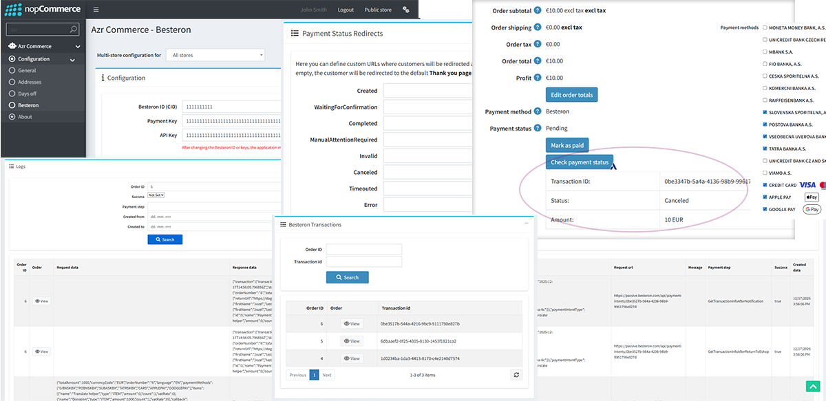 The Besteron Payment Gateway plugin enables secure and seamless online payments directly within your nopCommerce store. It connects your shop with the Besteron payment service, allowing customers to complete their orders quickly and safely using supported payment methods.